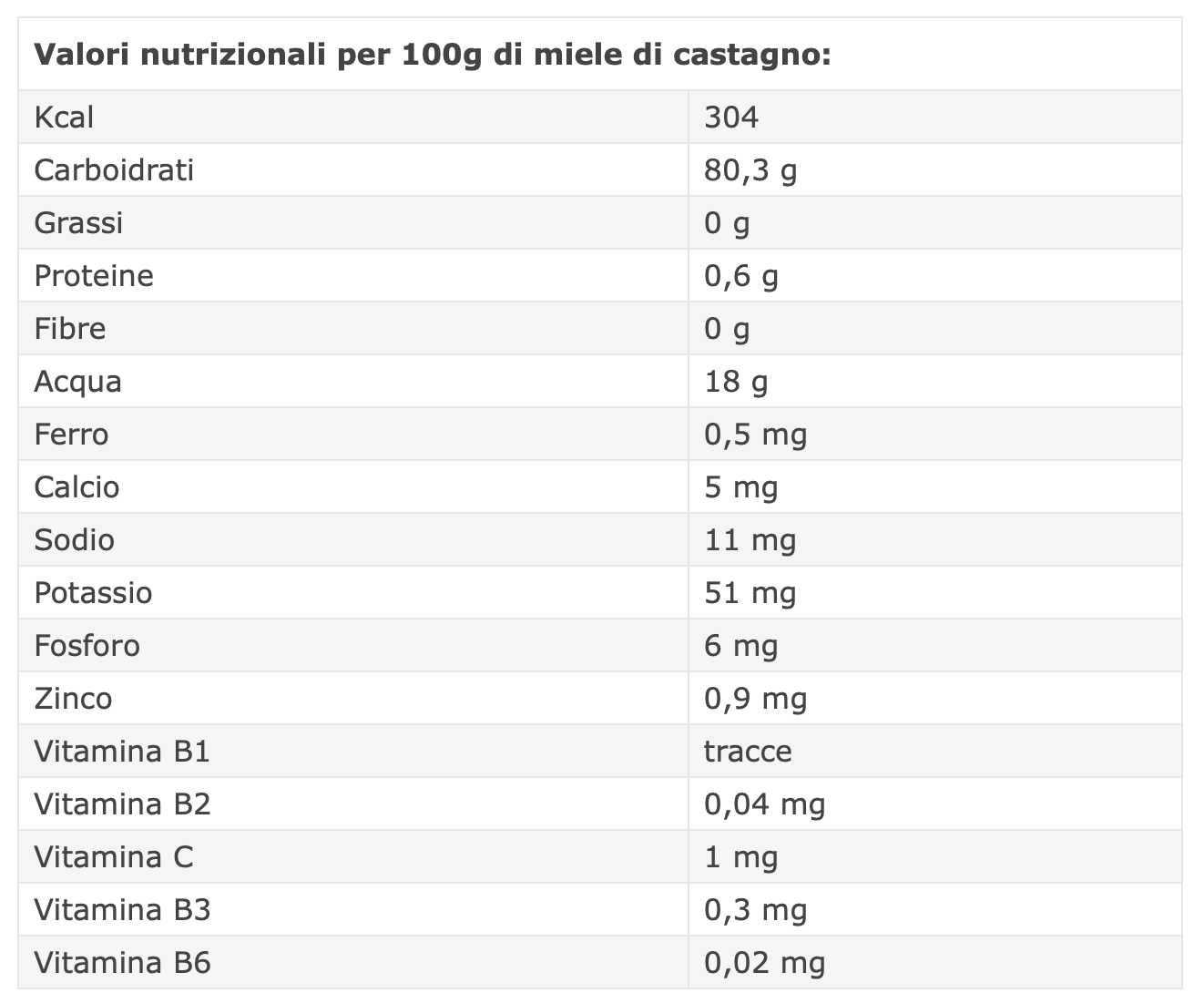 ✓ Ricco di energia In quanto concentrato di zuccheri e sali minerali pronti all’uso, il miele di castagno può essere utilizzato dagli sportivi subito dopo un intenso sforzo fisico per recuperare immediatamente parte delle energie spese.